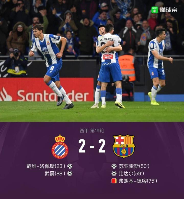 北京时间1月5日04:00,西甲第19轮迎来加泰罗尼亚德比大战,西班牙人主场对阵巴塞罗那。上半场戴维-洛佩斯率先头球破门,苏亚雷斯中柱。下半场苏亚雷斯扳平比分,比达尔头球反超,武磊在第73分钟替补上场并破门扳平比分,德容染红。最终,西班牙人2-2巴萨。