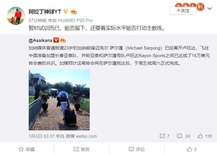 对于加纳前锋萨尔蓬将加盟长春亚泰的消息,微博名为“阿拉丁神球YT”的长春亚泰俱乐部营销中心主场赛事运行负责人表示,这名球员只是来球队试训,能否留下还要看他的实际水平。