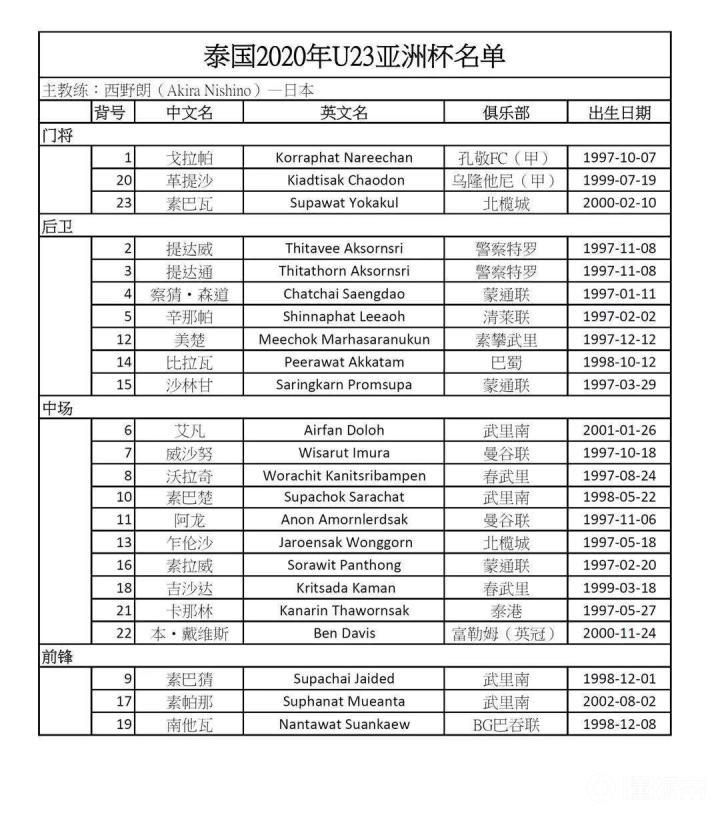 泰国目前阵中有一名留洋球员,目前效力于富勒姆的18岁英泰混血本-戴维斯,这名留洋的球员可能会给球队在阵容上进行战术多可能的补充。目前这一支泰国U23主要以泰国本土俱乐部武里南联球员为班底,武里南联在2019赛季的国内联赛中刚刚拿到亚军,实力不俗。因此这一支泰国U23可以说是集结了国内最优秀的年轻球员,加上主场作战,本土国民的支持,本场比赛取得开门红值得看好。