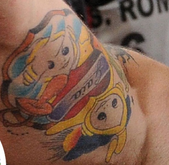 (图)德罗西的手臂上的一处特别文身,上面是天线宝宝和自己女儿盖娅的名字