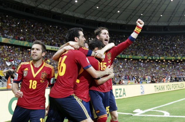 (图)2013年联合会杯上的西班牙国家队由巴萨、皇马及海外俱乐部的球员所组成