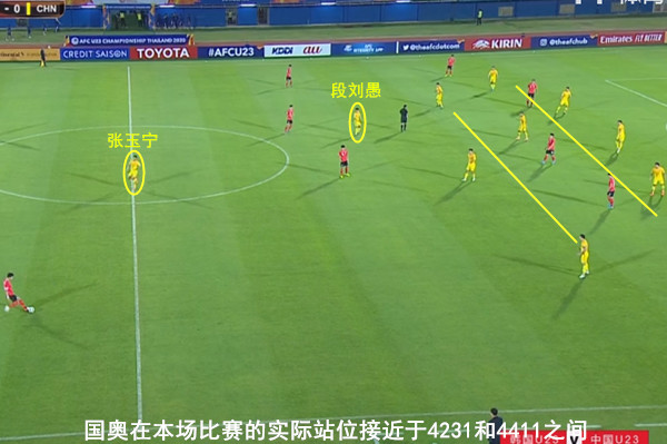 从开局后的站位来看,中国国奥的整体站位趋向于4231和4411之间的阵型,这与主教练郝伟此前担任助教的山东鲁能颇为相似。在张玉宁站稳中锋位置的基础上,段刘愚的活动范围非常大,进而在中锋身后发挥枢纽作用。同时,陈彬彬和胡靖航所在的两个边路拉开进攻空间,由此成为国奥队在进攻端的主要选择。因此,看似国奥开场选择雪藏了杨立瑜,但是进攻端的人员布局依然较为合理。