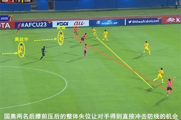在现代足球对后腰位置的要求越来越高的前提下,国奥的这两名后腰球员显然无法支撑起球队的整体攻防。对比韩国队经验丰富、配合默契的中场组成,在能力方面处于劣势的国奥队不得不主动让出球权和中场,可见球队优先立足防守并寻求反击的战术设计非常清晰。