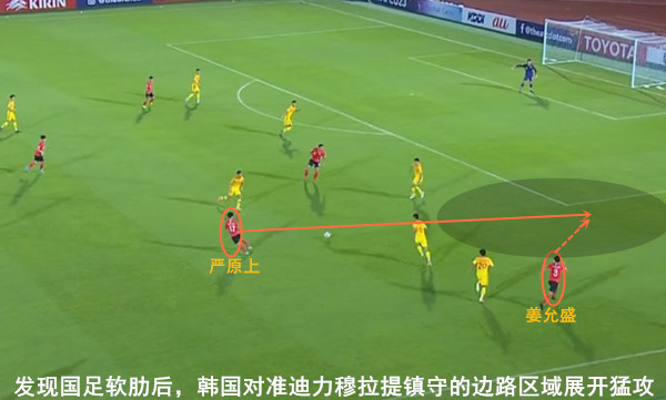 在历经开局阶段的试探后,韩国队明显发现国奥的整体防守其实存有隐患——受制于个别位置的球员能力有限而暴露出明显软肋。于是,韩国在利用国奥区域防守保护不足的同时,随着比赛推进瞄准国奥的防守软肋展开攻势,特别是针对国奥由迪力穆拉提所镇守的边路及其身后区域不断猛攻。