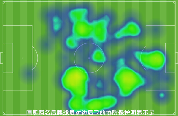 然而无法忽视的是,国奥这对后腰搭档在防守端的积极性和勇猛度有余,但是在球队立足于整体防守时缺乏必要的分工和保护,甚至有时出现两人同时失位的情况。如此隐患颇为致命,首要带来的问题就是国奥整体防线布局存有问题,特别是对边路的保护有所缩减,进而不断暴露出诸多明显空当和失误。