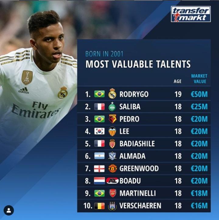 近日,德国转会市场网站更新了2001年出生球员的身价,发布前十榜单。其中,皇马的巴西球星罗德里戈以5000万欧的身价高居榜首,是第二名萨利巴的两倍。