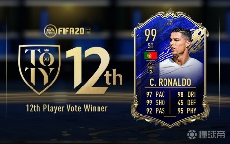 EA SPORTS在推特上公布了《FIFA 20》年度最佳赛季第12人的投票结果,葡萄牙巨星克里斯蒂亚诺-罗纳尔多当选。