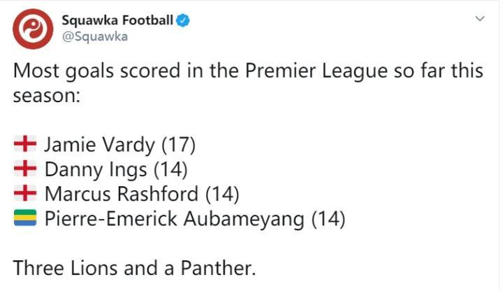 截至目前,英超联赛进行到了第22轮,而到目前为止,英格兰球员包揽本赛季至今英超射手榜前三。根据数据网站Squawka给出的数据显示,本赛季至今的英超射手榜前三名分别为莱斯特城前锋瓦尔迪、南安普顿前锋丹尼-英斯以及曼联前锋拉什福德。