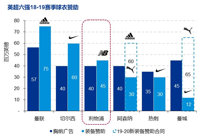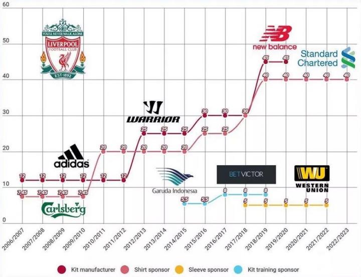 而在相关媒体透出的利物浦与耐克的合同中,除了3000万镑的固定赞助费外,耐克还需每年向利物浦支付许可产品净销售额(净销售额=销售收入-销售退货金额)的20%(鞋类除外)和许可鞋类净销售额的5%。除此之外,耐克还需和利物浦展开多方面多领域的合作,这也是利物浦不惜和前任新百伦闹上法庭的最重要原因。无论是多领域的头部体育明星,还是全球尤其是在亚洲地区受到认可销售网络,这些都是新百伦所不能给到利物浦的。