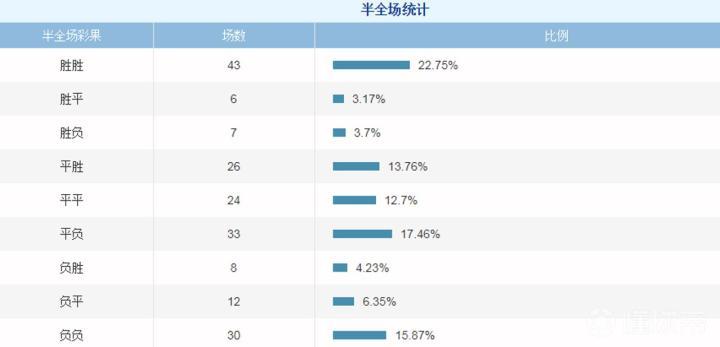 4、半全场:“一胜到底”近四成,半场平局主队告急:半全场胜平负玩法方面,“胜胜”和“负负”的彩果占比达到38.6%,如果能在上半场确立领先优势,“一胜到底”是比较大概率的“剧情走向”。不过,如果上半场打成平局,下半场最可能出线的结果并不是平局,而很可能是客队取胜——在上半场打成平局的选项中,“平负”的占比最高(17.5%),如果主队上半场不能取胜,很可能会在下半场的比赛中输掉比赛!
