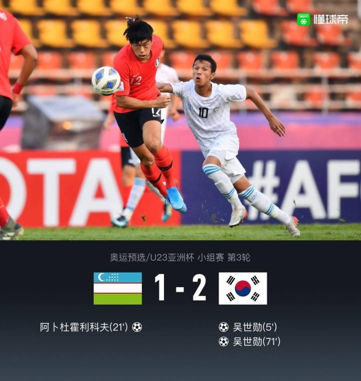 全场比赛结束,U23韩国2-1战胜U23乌兹别克。