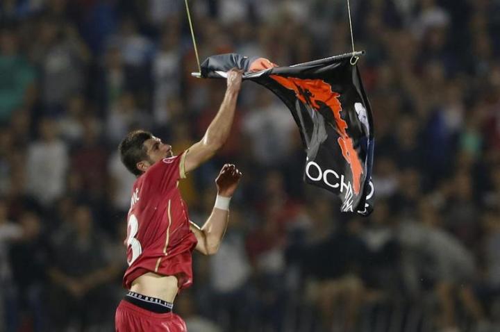 (图)塞尔维亚前锋米特洛维奇扯下大阿尔巴尼亚旗帜引发两队冲突