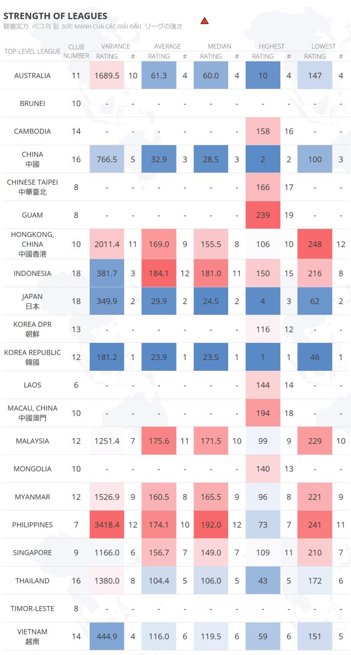 【!】 一个联赛实力是非常综合的概念,涉及很多衡量标准,包括且不限于球队身价、俱乐部营收状况、关注度、上座率、经济实力、留洋人数等等。SOCCER-CJKV工作组仅以竞技比赛数据为切入点,对相关比赛结果进行量化分析,試圖反映一个联赛的技术水平。请注意,我们仅搬运、分析、展示各国/地区顶级联赛实力相关的数据,但并不对各联赛进行一概而论的整体排名。