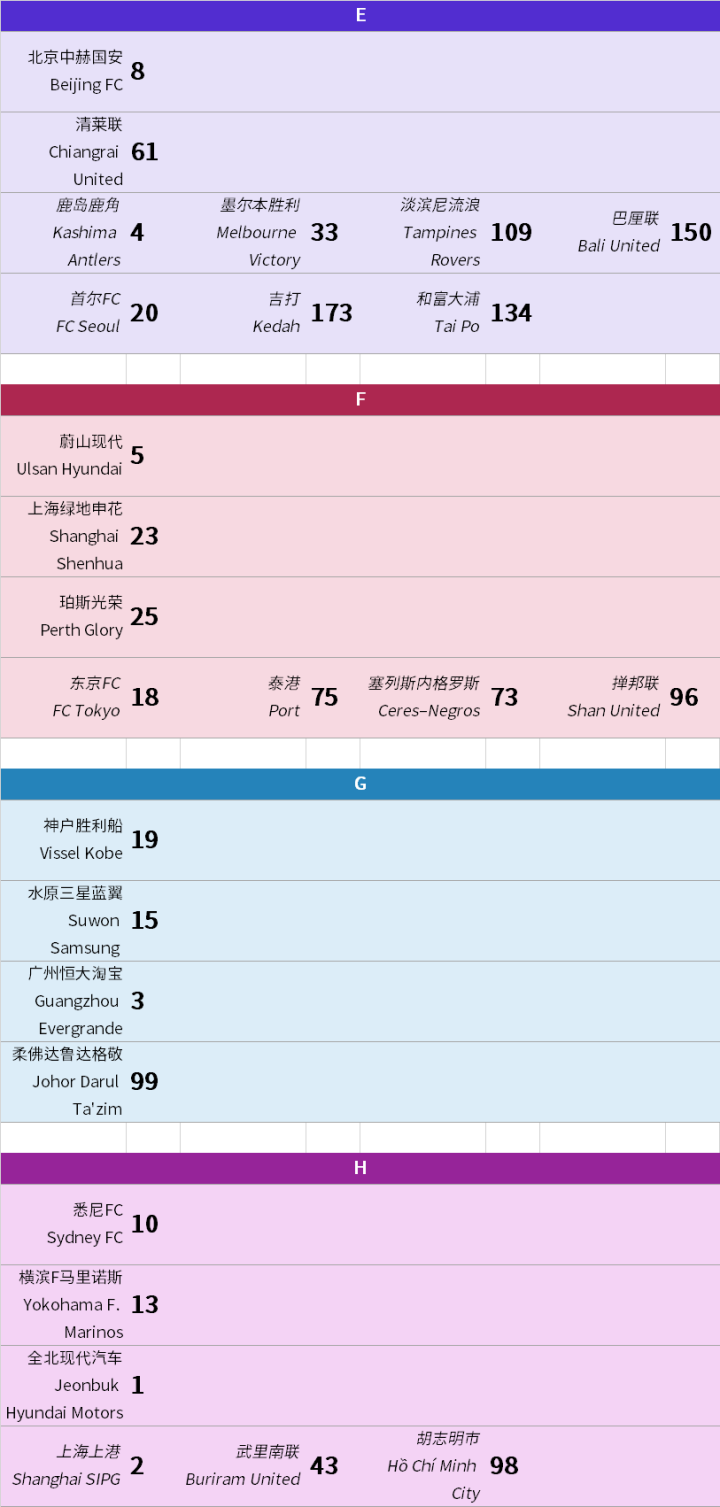 最后,附上EACR最新一期排名中2020亚冠参赛队的排名情况: