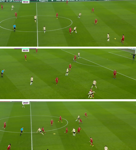 利物浦的433体系在常规攻击阶段展开队形时,借鉴了三中卫和控球战术的思路,两翼边后卫进抵边锋位置,三人中场里有人保护中路,也有人保护强侧边卫身后区域,中后场的六人出球小组不断变换站位。马内拉边接球,罗伯逊在突进时会向肋部移动,亨德森后撤到防线上来向前传球,红军球员为摆脱曼联的盯人防守做出很多努力,这帮助他们在上半场中段成功地控制了比赛。