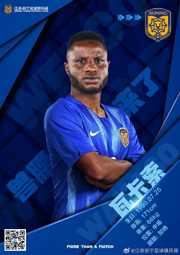 江苏苏宁官方宣布,加纳中场穆巴拉克-瓦卡索加盟。