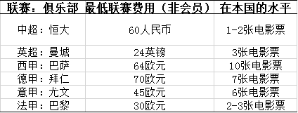 中超和五大联赛现场观看最低费用(非会员)
