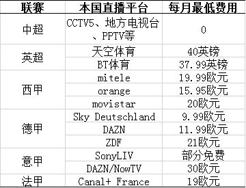 中超和五大联赛直播观看费用