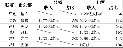 中超和五大联赛转播收入和门票占比