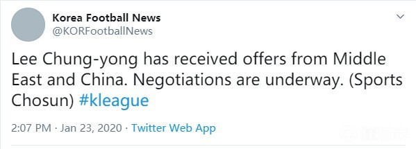该博主转引了韩国媒体Sports Chosun消息,在推特上写道:“李青龙收到了来自中东和中国的报价。目前谈判正在进行中。”