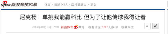 2014年10月03日,尼克杨:单挑我能赢科比 但为了让他传球我得让着