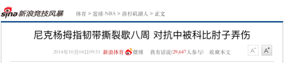2014年10月04日,尼克杨拇指韧带撕裂歇八周 对抗中被科比肘子弄伤
