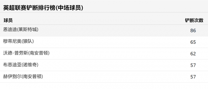“在我看来,在铲断和赢回球权这方面,他是整个英超联赛最优秀的球员”,恩迪迪的队友麦迪逊在此前接受BBC采访时表示。