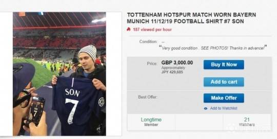 原本这则场外小故事就要迎来一个温暖人心的结局,可没料到仅过了一天,这件孙兴慜的球衣就以“拍卖品”的身份出现在了国外购物网站Ebay的交易平台上,商品名为“热刺vs拜仁落场球衣(2019.12.11) 7号 孙兴慜”,标价则达到了惊人的3000英镑(约27000元人民币)。