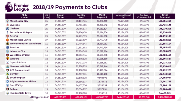 (图)英超高额的转播费收入给了所有球队巨额的分红,这些数字在脱欧之后很难继续提高