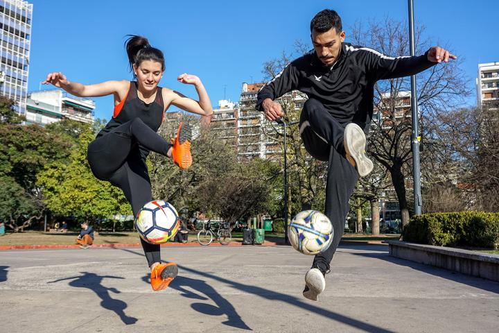 所以,我们首先练习正确的时机,我们用手抛球,一只脚接球上挑,另一只脚收起来暂时不交叉,用最简单的方法让我们掌握球下落的时机和感受脚尖触球的感觉。