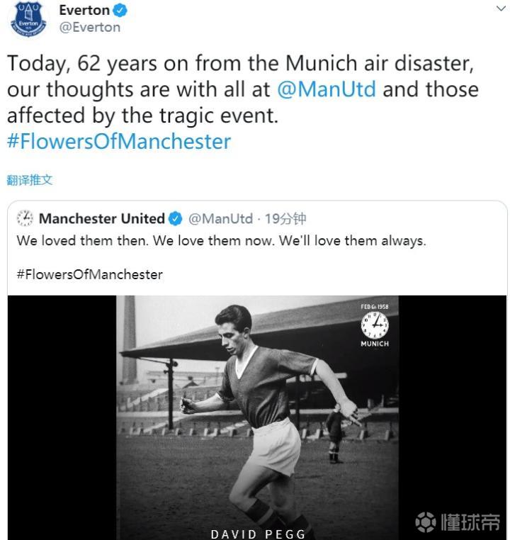 埃弗顿官方推特写到:“距离慕尼黑空难已经过去了62年,我们的思绪和所有在空难中遇难的人在一起。”