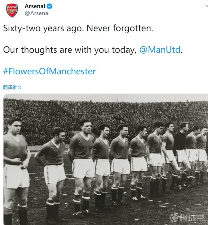 阿森纳官方推特写到:“我们永远不会忘记62年前发生的那场空难,今天,我们的思绪和那些在空难中遇难的人们在一起。”