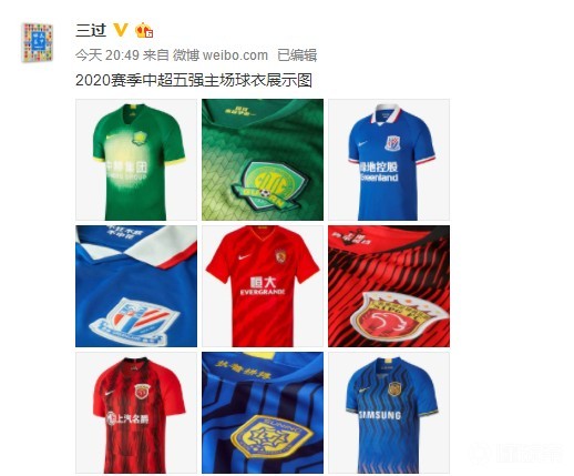 中国足球研究院负责人、微博博主“三过”展示了中超五队2020赛季的主场球衣及细节。
