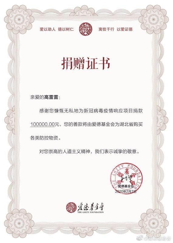 高雷雷向疫区捐款10万元,用于为医院重症病房提供呼吸器