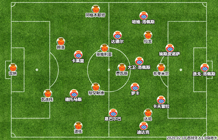 开场后,主场作战的西班牙人是表现地更为积极的一方,他们将阵型重心前移到中圈弧附近,恩巴尔巴和达德尔轮流前压配合双前锋组成第一道防线实施逼抢。不过,西班牙人在压迫中存在着明显的前后脱节问题,马洛卡一旦成功突破主队的第一道防线,就能获得提速冲击的机会。