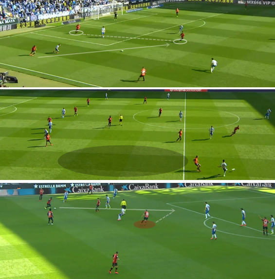 在此前使用四中场的比赛中,西班牙人整体被压制后显得缺少快速反制能力,后场球员的压力很大。防守时的位置选择决定了恩巴尔巴在反击中能获得更大的空间,他的快速推进能力可以得到很好的发挥。恩巴尔巴能够在边路打开纵深,德托马斯和卡莱里就能同时在中路冲击球门,马钦时代锋线兵力不足的问题得以解决。上半场,西班牙人在进攻中的主要问题是中场球员的跟进速度比较慢,阿韦拉多要求边后卫将更多的精力放在防守端,恩巴尔巴在侧翼持球时得不到太多支持,倾向于依靠卡莱里和德托马斯的个人能力来制造威胁。