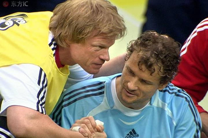 恩怨易了、辉煌难灭!德国世界杯开幕后,坐上替补席的卡恩时刻待命、并肩作战,并在1/4决赛面对阿根廷的点球大战前上演了永载史册的一幕:当德国队门将教练科普克把一张记载对手球员罚球习惯的纸条塞给莱曼后不久,卡恩在这关键时刻出现在莱曼身前——卡恩蹲下身子鼓舞几句并拍了下莱曼的头后,两人随即露出一丝微笑,然后将手紧紧握在了一起!
