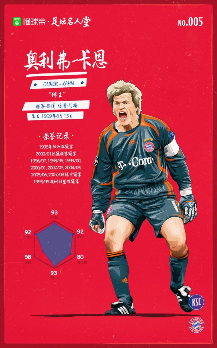 在世界足坛的历史中,他的名字意味着领袖、意味着意志、意味着冠军;在用脚说话的赛场上,手套是他的舞鞋,掠空是他的标识,怒吼就是他的气场;他用或轻盈或激昂的舞步将扑救演成了一种艺术,他用纵身鱼跃和屡化险情让门将上升为真正王者,将全身激情化作战斗的勇气,以震撼的气场演绎不倒的旗手。他就是奥利弗-卡恩,真正代表德意志精神的伟大传奇!