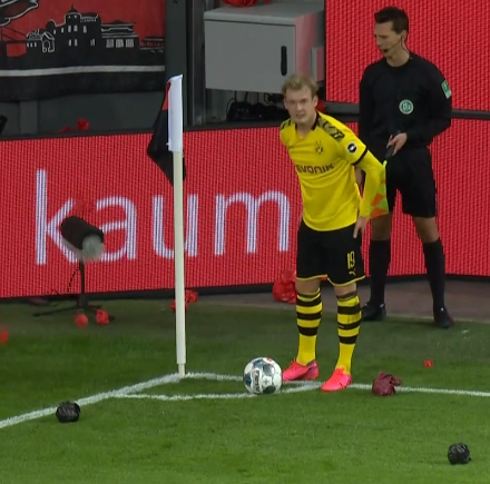 随后多特蒙德立即予以回击,布兰特前场断球后杀入禁区射门被赫拉德斯基封出底线。而正是凭借这次角球,胡梅尔斯头球将球砸进网底。而原本要主罚角球的是药厂旧将布兰特,因为被主场球迷不断掷物干扰而放弃,之后方有桑乔助攻胡梅尔斯扳平比分。
