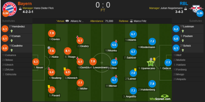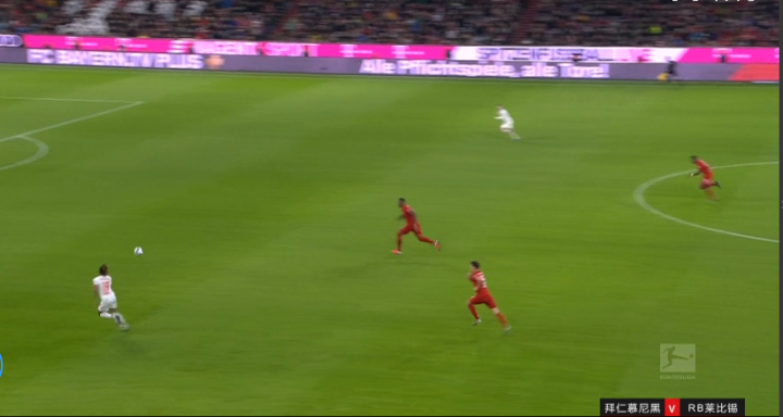 这场比赛的上半场,莱比锡在防守端布下重兵,主场作战的拜仁也是理所当然地主导着控球权。不过由于进攻手段略显单一(这点之后会更详尽的分析),拜仁虽然占据着场面优势但面对对手众志成城的防守,球队显得办法不多。古拉西奇和于帕梅卡诺的出色表现,也让拜仁多次进攻无果而终。
