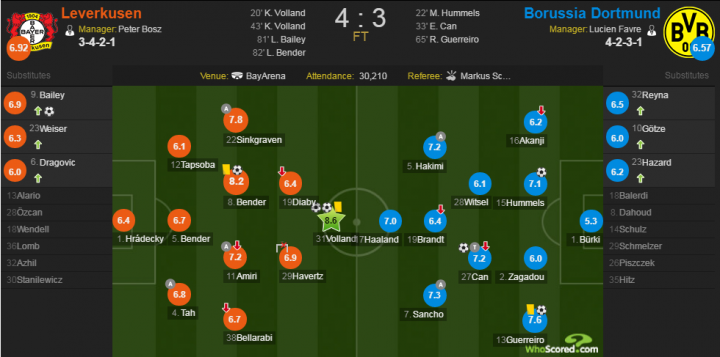 而这场比赛的交战双方,天赋异禀的多特蒙德和注重控球的勒沃库森,正是契合德甲联赛的上述特质。两队进球数均排在德甲前列;主队勒沃库森的首发中,门将赫拉德斯基及本德兄弟均为30岁,年龄并不算大的他们已经是阵中年龄最长者;而客队多特蒙德更是拥有桑乔和哈兰德两位全欧最火的00后。这场对决,堪称本赛季德甲迄今的最佳比赛。