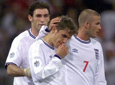另一边只要打平即可出线的英格兰队在2:1领先的情况下再遭逆转,先是替补门将马丁击球不远被对手扳平,第89分钟出任左后卫的菲尔内维尔禁区内鲁莽犯规送出点球,罗马尼亚人点球绝杀将英格兰人也送回了家。菲尔内维尔从此再也无缘国家队,而29岁的一代锋霸希勒也就此告别国家队。