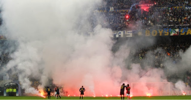局势没得到控制,国米球迷依然向场内投掷爆炸物和杂物,此时的米兰球员退到更衣室,而他们的球迷在现场打出GAME OVER”(比赛结束)等标语。