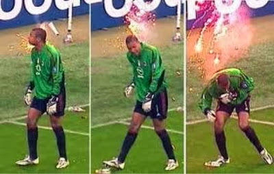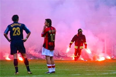 这一事件激怒了梅阿查的国米球迷,他们向场地内大量投掷杂物,包括矿泉水瓶、打火机、硬币,甚至还有刚刚脱下的皮鞋。米兰门将迪达在清理场地时,被一枚正燃爆的焰火击中右侧肩膀后倒地,巴西人表情痛苦,紧急来到场下察看伤势,主裁随即宣布比赛暂停。