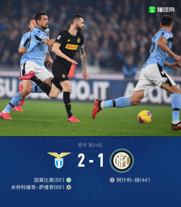 北京时间2月17日3:45,意甲第24轮,拉齐奥主场迎战国际米兰。上半场,米林科维奇的远射击中横梁,斯特拉科沙挡出卢卡库的射门,半场结束前阿什利-扬补射破门斩获意甲首球。下半场开场不久,因莫比莱命中点球将比分扳平,米林禁区内推射反超比分。最终,国米客场1-2遭拉齐奥逆转。