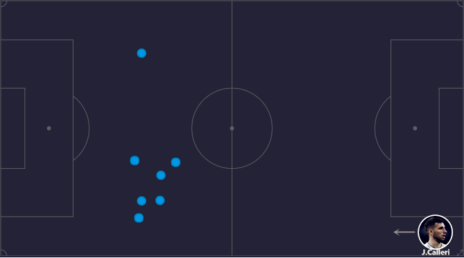 作为带动三线运转的龙头,卡莱里和维克托-桑切斯在这套体系内的消耗较大,前者的战术执行力较强但作为中锋的杀伤力有所不足,后者作为后腰的移动和覆盖能力稍显不足。阿韦拉多希望武在进攻中与卡莱里形成呼应,通过积极的跑动来保护边肋部,缓解后腰的防守压力,中国7号不辱使命。