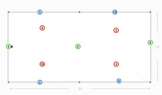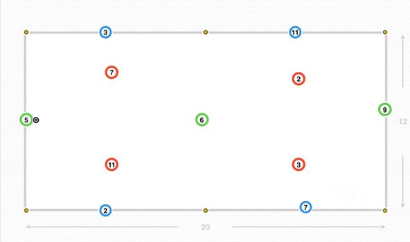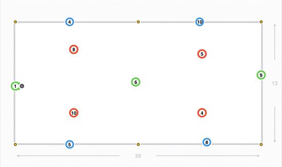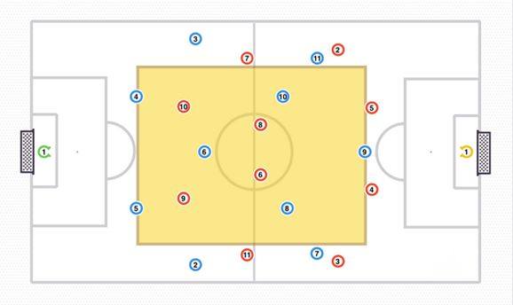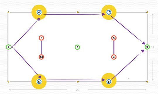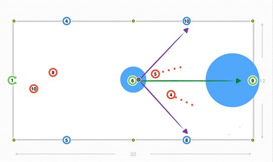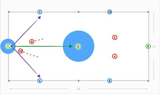 宽度是由外侧的球员(蓝色的4、5、8和10号)提供,对手防守队员(红色的4、5、8和10号)试图盯防他们,门将(绿色1号)利用中路留出的空间,传给后腰(绿色6号),接着穿透中路区域给中锋(绿色9号)。