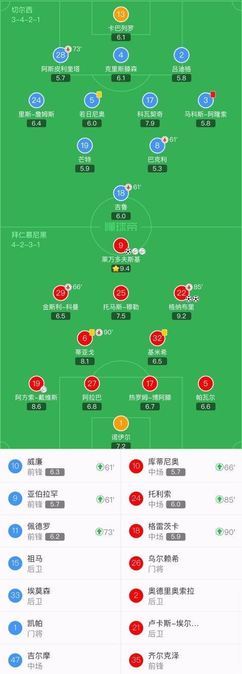 第54分钟,莱万助攻格纳布里梅开二度。拜仁2-0切尔西。