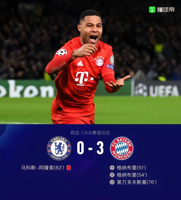 北京时间2月26日04:00,欧冠1/8决赛首回合,切尔西主场迎战拜仁慕尼黑。上半场穆勒头球击中横梁,卡巴列罗发挥稳健力保球门不失。下半场莱万两次助攻格纳布里完成梅开二度,随后莱万自己再进一球,科曼伤退,阿隆索染红。最终,拜仁3-0切尔西。