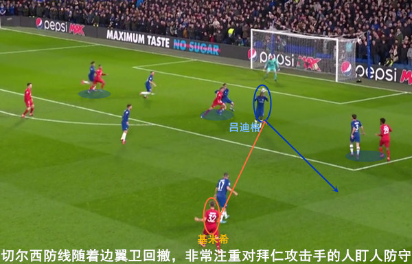 在严格限制拜仁锋线接应者的同时,蓝军还适时尝试对拜仁中后场出球点加以限制。其中,或许是看到诺伊尔在上周末联赛中出现失误丢球,因此连这位拜仁门将也成为蓝军主动上抢的重点对象。其实,拜仁自身面对高压防守时便存有不足,例如诺伊尔在上半场确实出现了后场传递失误,这让尚未落位的拜仁防线一度风声鹤唳,此后不得不更多采取高空球进行处理,而这正是蓝军所期待的效果。